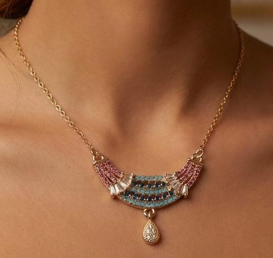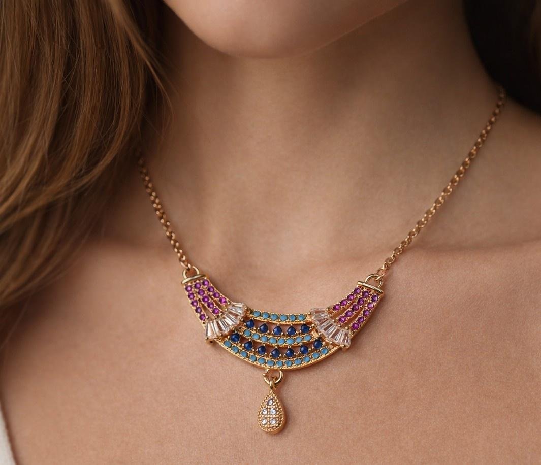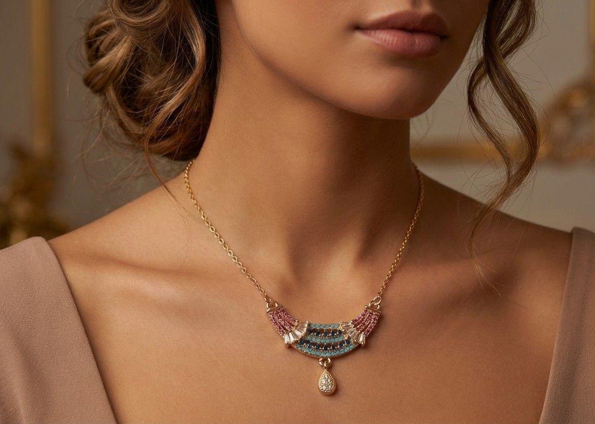 Our crescent necklace featuring sapphire blue and turquoise crystals with a graceful drop charm—perfect for festive and party wear.