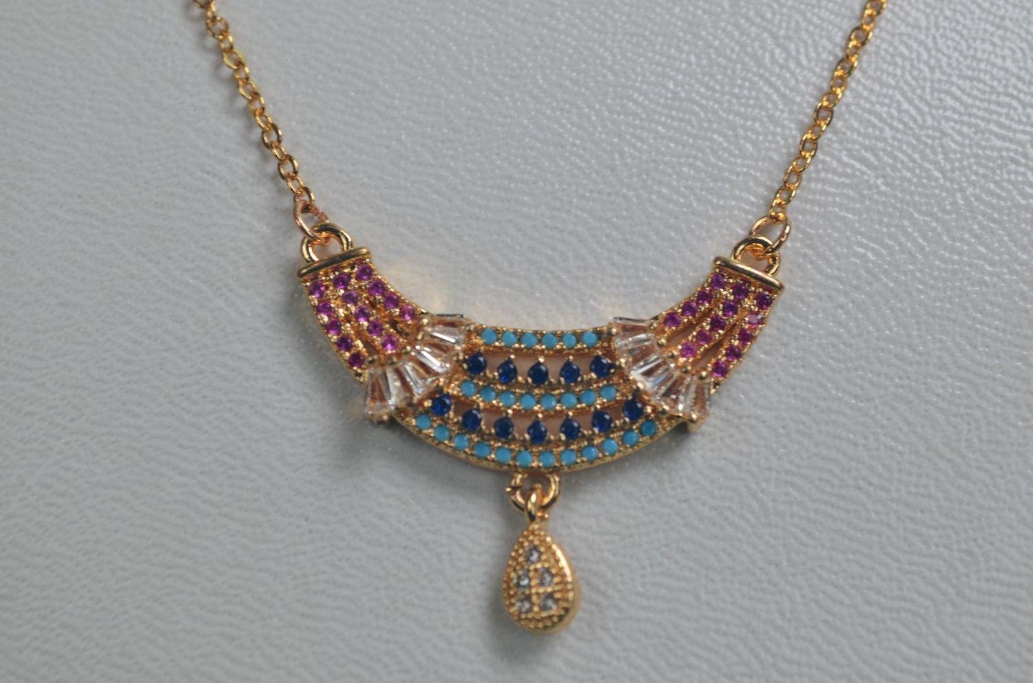 Our crescent necklace featuring sapphire blue and turquoise crystals with a graceful drop charm—perfect for festive and party wear.