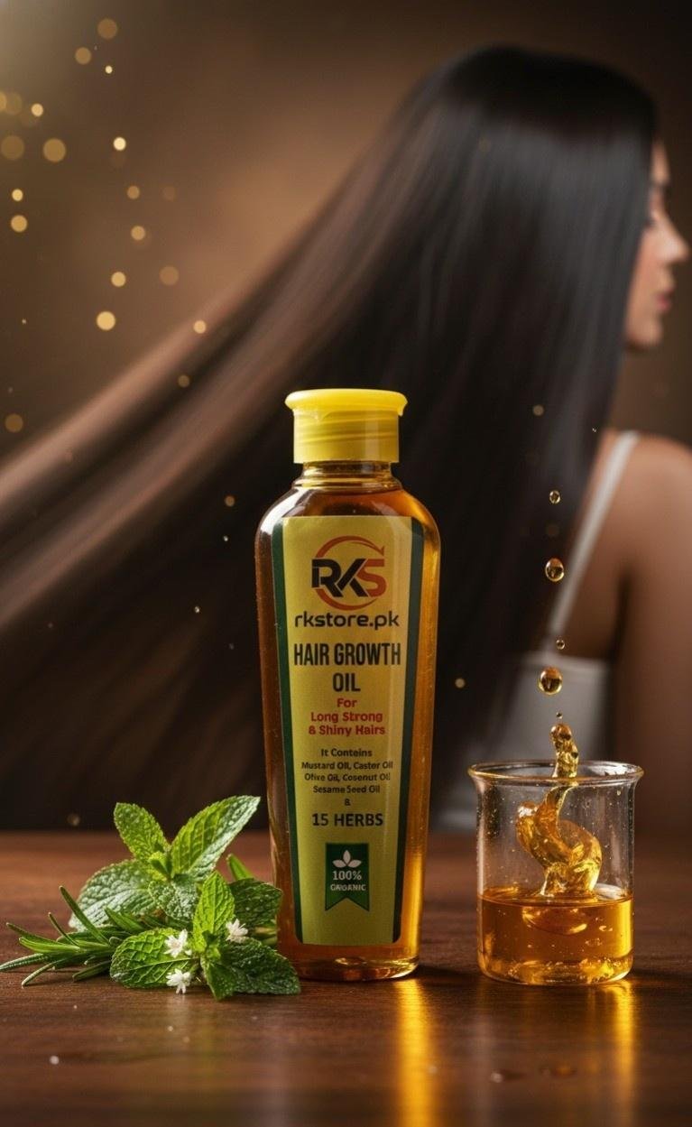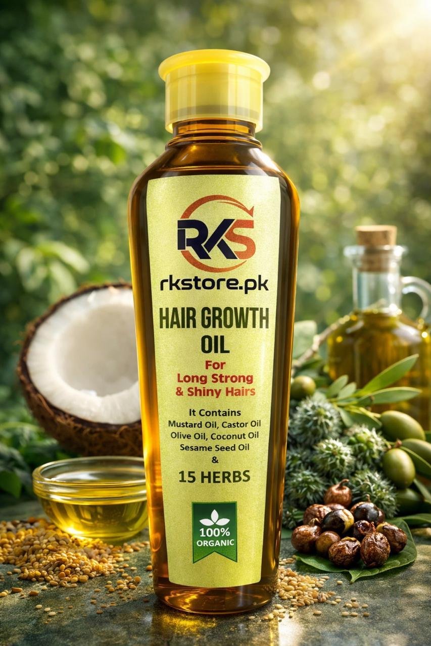 RK Store Hair Growth Oil is a powerful blend of 100% organic oils and 15 natural herbs, specially formulated to nourish the scalp, strengthen hair roots, and promote healthy hair growth. Enriched with time-tested natural ingredients, this oil helps reduce hair fall, improve hair texture, and restore